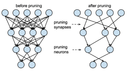 AI 신경망 모델에서, 노드(뉴런) 혹은 연결(시냅스)을 제거 → 모델의 크기 및 계산 비용 절감을 도모하는 기법