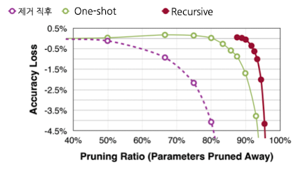 - Pruning을 한번에 많이 하면, 성능 손실이 클 수 있음