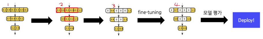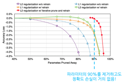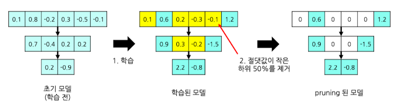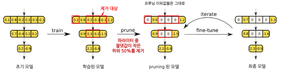 - 가중치 절댓값을 기준으로, 조금씩 반복해서 잘라내고 다시 학습시키는 Pruning 기법