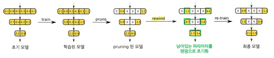 - Pruning 직후에는, 학습된 모델 파라미터 중 일부만 잘려나간 상태임 → 이 이후, 최종 모델까지 추가 학습을 어떤 파라미터 값으로 시작할 지에 대한 구분