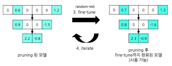 - Pruning 직후 상태 그대로 이어 fine-tuning 진행