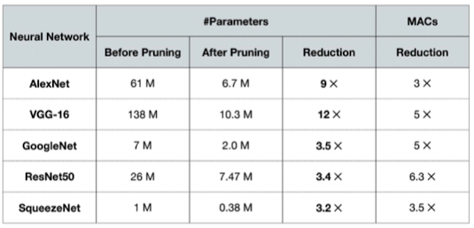 - Pruning을 통해, 적은 것은 3.2배 부터(SqueezeNet) 많은 것은 12배까지(VGG-16) 파라미터 절약
