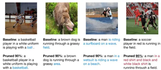 - 하지만, 95% Pruning한 모델이 생성하는 이미지는 Baseline 모델에 비교해서 생성하는 이미지에 문제가 발생하기 시작함 → 한 축구경기에서 뛰는 선수들의 유니폼 색깔이 3가지임(불가능)