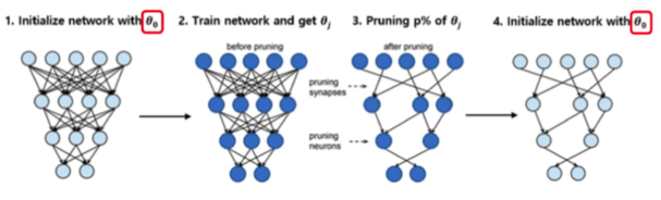 - “pruning된 작은 네트워크”구조(3번 과정에서 생성된 네트워크 구조)는 그대로 둔 채, 그 안의 가중치 값만 처음 랜덤 초기값으로 리셋시켜주는 과정