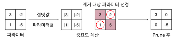- Pruning 단위: 파라미터 하나하나가 pruning 대상 단위 → 값을 0으로 변경