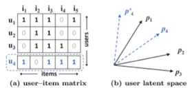 - user 4는 user 1과 가장 가까우니, 우측 그림의 latent space에서 파란 점선과 같이 표현됨
