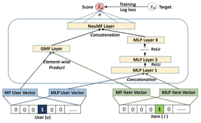 - $\hat{y}_{u, i} = \sigma(h^T[\phi^{GMF}\phi^{MLP}])$