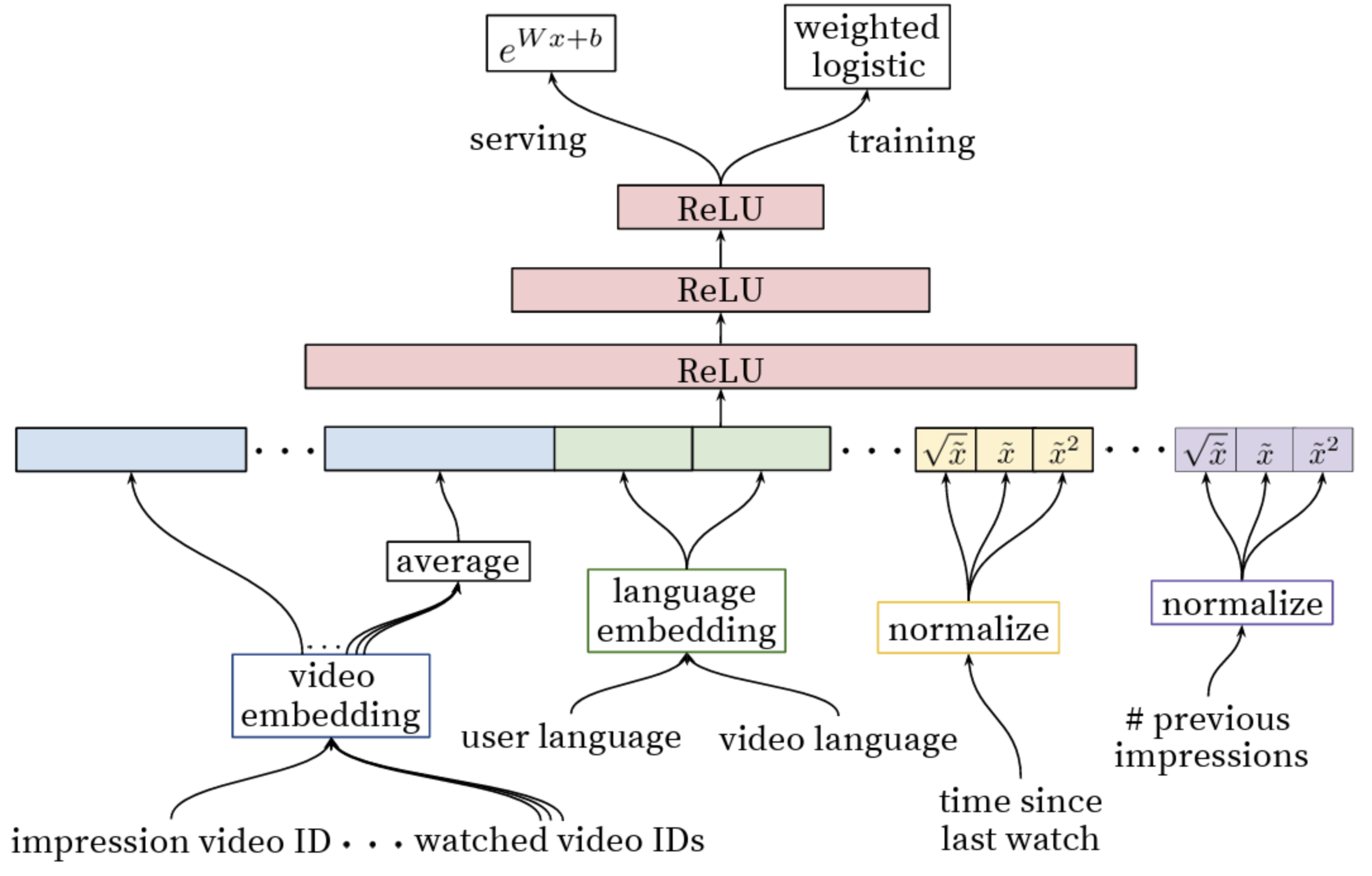 - 여러 임베딩(영상, 언어, 사용자 등) & 정규화된 연속형 feature(시간, 노출 횟수 등) ⇒ 하나의 긴 vector로 concat