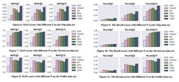 대체적으로 N값과 관계없이, 다른 top-N 추천 모델에 비해 더 높은 MAP 및 recall 값을 보임